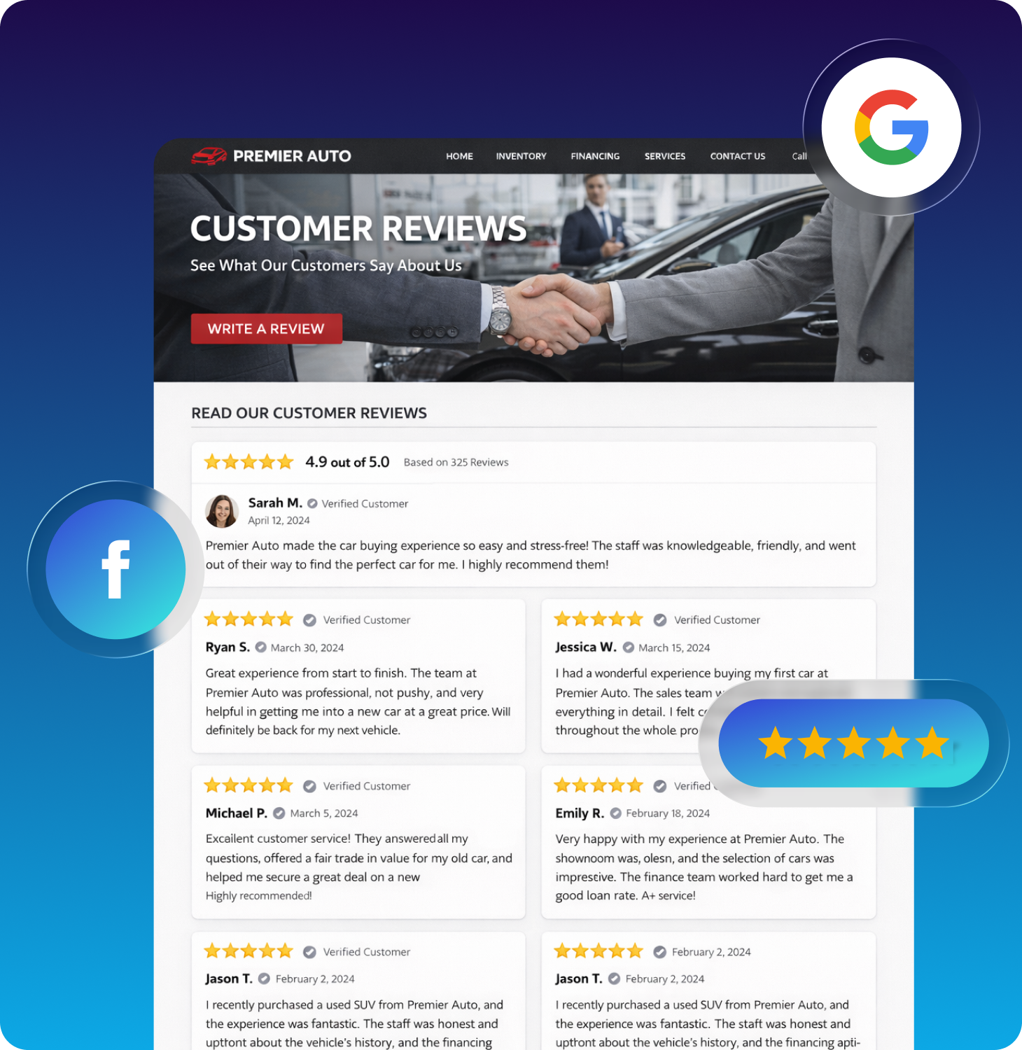 Social proof influences undecided shoppers by reinforcing your dealership’s credibility and service quality. Some dealerships even embed live review feeds or prompt customers to leave reviews directly through the website.